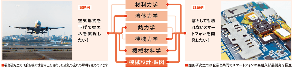 「機械工学」とは機械の科学的な視点から設計し生産するための学問です。目に見える・形があるモノを生み出して社会に貢献することができる、それが機械エンジニアの醍醐味です。機械エンジニアのアウトプットは設計図です。その設計図を書くためにはさまざまな知識が必要です。特に重要なのが「4力学」と呼ばれる学問です。材料の変形や強度を考える「材料力学」、空気や水の流れを考える「流体力学」、熱から運動への変換や、熱の流れを考える「熱力学」、機械の振動や運動を考える「機械力学」です。